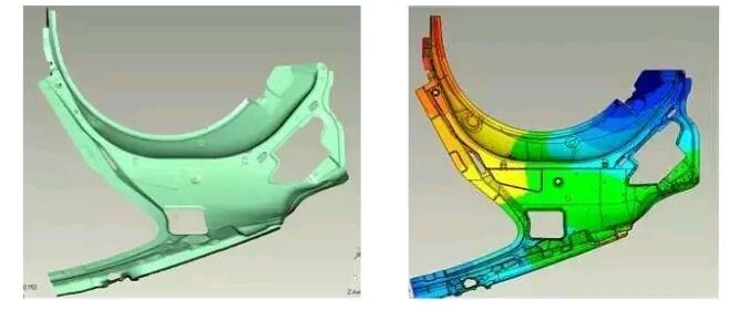 三維掃描系統(tǒng)能夠對汽車進行裝配檢測,尤其是使用傳統(tǒng)手段難以檢測的自由曲面更加有效。在對整車或者部件進行掃描后,導入專業(yè)質量檢測軟件進行尺寸檢測,生成的色差分析圖和誤差分析報告能夠更直觀了解誤差。這種自由曲面的三維檢測方式節(jié)省了人力和時間,讓制造商快速生產出精度高,質量可靠的汽車配件,滿足了客戶的需求。