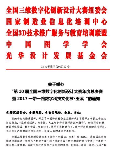 第10屆全國(guó)三維數(shù)字化創(chuàng)新設(shè)計(jì)大賽年度總決賽暨2017一帶一路數(shù)字科技文化節(jié)定于2017年12月6日至12月9日在云南省玉溪市盛大舉辦。“數(shù)造杯”數(shù)字化創(chuàng)意設(shè)計(jì)與智能制造(3D打?。┐筚愖鳛橹骰顒?dòng)之一,將于12月6日-12月9日同期舉行?,F(xiàn)將相關(guān)活動(dòng)具體安排通知如下: