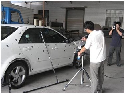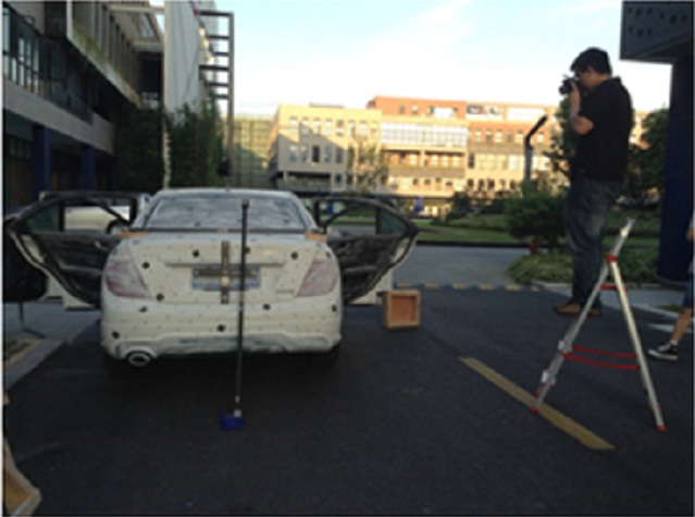 由于攝影測量系統(tǒng)得到的是離散孤立圓點的坐標,為了得到大型物體(如汽車油泥模型)的完整點云,通常與3DSS三維掃描儀配合使用,以輕松得到物體的高精度點云。在這里,攝影測量系統(tǒng)的作用是得到物體的整體框架,3DSS分塊掃描得到物體的局部點云,并且通過框架點自動拼接起來。